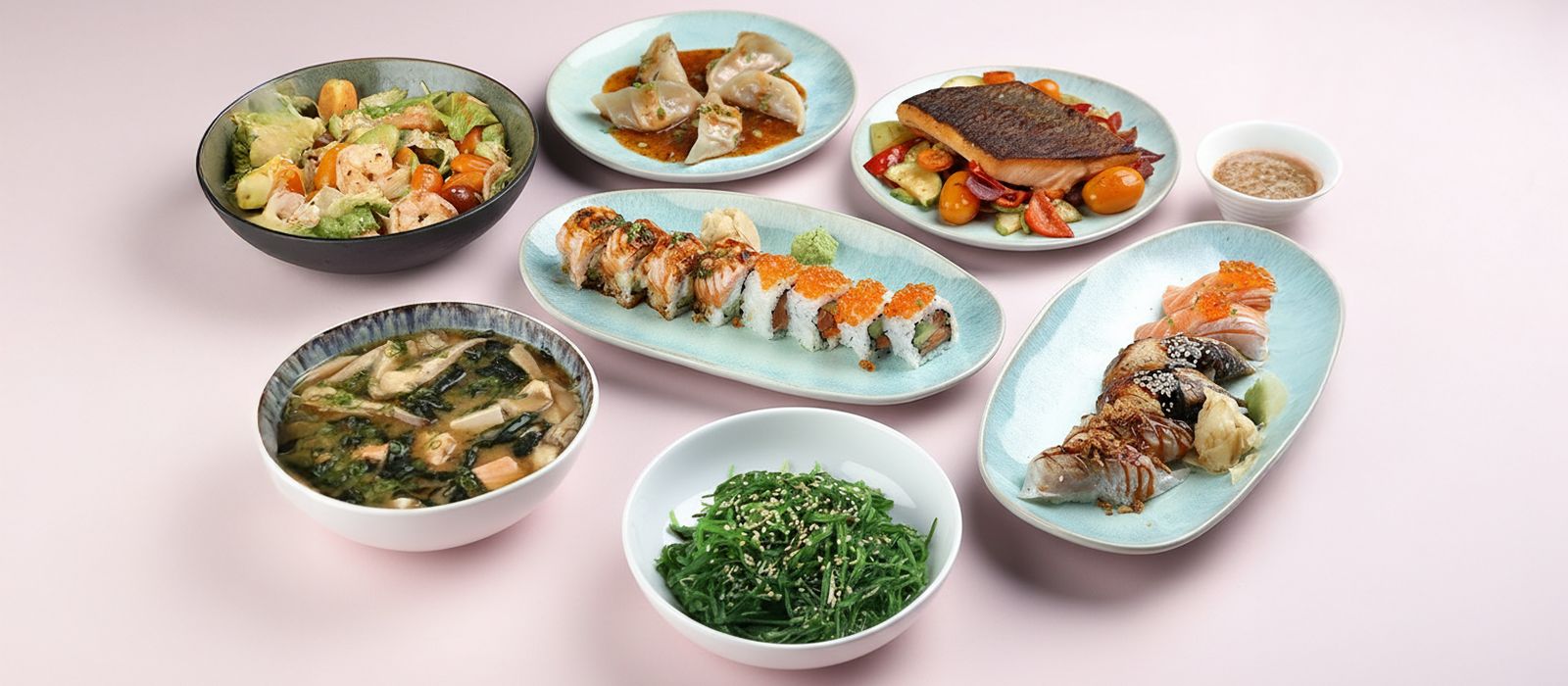 მისო პასტა, სოკო შიიტაკე გამხმარი, ტოფუ, ხმელი ვაკამე, მწვანე ხახვი, ორაგულის ფილე.